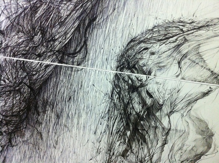 ボールペンで描いた上から墨を持ってきたり、墨で荒らした表情を活かしてボールペンを引っ掻いたり。元々油絵をやってたので、輪郭ありきでない、抽象的なニュアンスからイメージを拾うのは経験済みです。